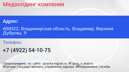 Медхолдинг, компания по адресу 600022, Владимирская область, Владимир, Верхняя Дуброва, 9 в дальнейшем Организация, размещена в следующих категориях:
