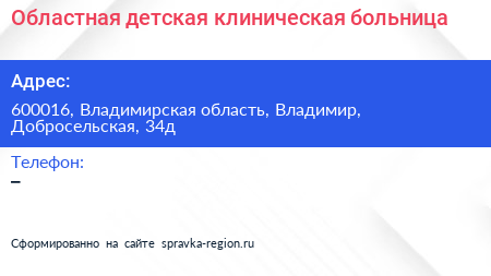 Областная детская клиническая больница по адресу 600016, Владимирская область, Владимир, Добросельская, 34д в дальнейшем Организация, размещена в следующих категориях: