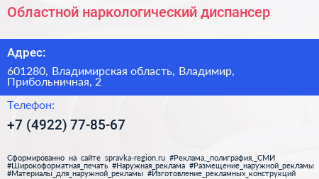 Областной наркологический диспансер по адресу 601280, Владимирская область, Владимир, Прибольничная, 2 в дальнейшем Организация, размещена в следующих категориях: