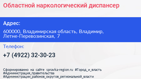 Областной наркологический диспансер по адресу 600000, Владимирская область, Владимир, Летне-Перевозинская, 7 в дальнейшем Организация, размещена в следующих категориях: