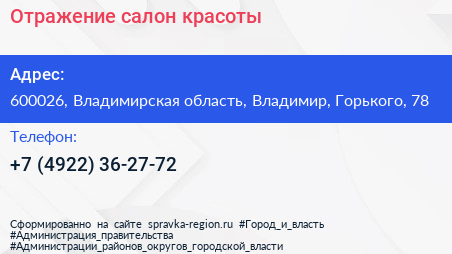 Отражение, салон красоты по адресу 600026, Владимирская область, Владимир, Горького, 78 в дальнейшем Организация, размещена в следующих категориях: