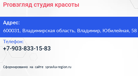 Proвзгляд, студия красоты по адресу 600031, Владимирская область, Владимир, Юбилейная, 58 в дальнейшем Организация, размещена в следующих категориях: