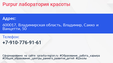 Purpur, лаборатория красоты по адресу 600017, Владимирская область, Владимир, Сакко и Ванцетти, 50 в дальнейшем Организация, размещена в следующих категориях: