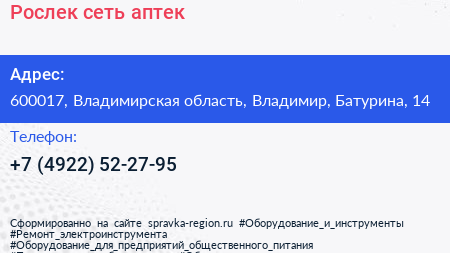 Рослек, сеть аптек по адресу 600017, Владимирская область, Владимир, Батурина, 14 в дальнейшем Организация, размещена в следующих категориях: