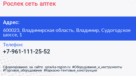 Рослек, сеть аптек по адресу 600023, Владимирская область, Владимир, Судогодское шоссе, 1 в дальнейшем Организация, размещена в следующих категориях: