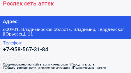 Рослек, сеть аптек по адресу 600901, Владимирская область, Владимир, Гвардейская (Юрьевец), 11 в дальнейшем Организация, размещена в следующих категориях:
