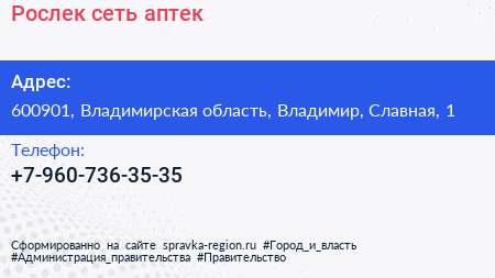Рослек, сеть аптек по адресу 600901, Владимирская область, Владимир, Славная, 1 в дальнейшем Организация, размещена в следующих категориях: