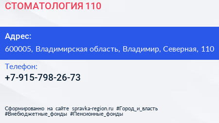 СТОМАТОЛОГИЯ 110 по адресу 600005, Владимирская область, Владимир, Северная, 110 в дальнейшем Организация, размещена в следующих категориях: