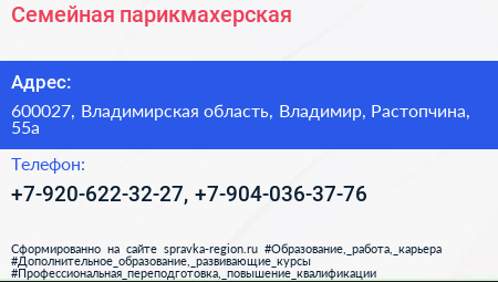 Семейная парикмахерская по адресу 600027, Владимирская область, Владимир, Растопчина, 55а в дальнейшем Организация, размещена в следующих категориях: