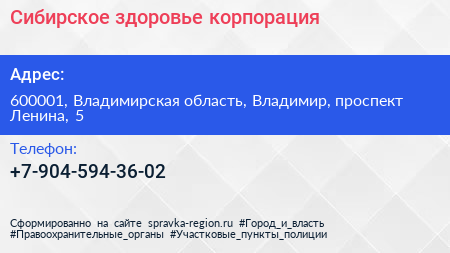 Сибирское здоровье, корпорация по адресу 600001, Владимирская область, Владимир, проспект Ленина, 5 в дальнейшем Организация, размещена в следующих категориях: