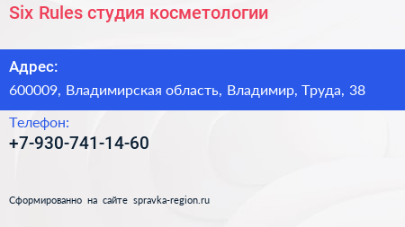 Six Rules, студия косметологии по адресу 600009, Владимирская область, Владимир, Труда, 38 в дальнейшем Организация, размещена в следующих категориях: