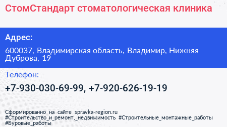 СтомСтандарт, стоматологическая клиника по адресу 600037, Владимирская область, Владимир, Нижняя Дуброва, 19 в дальнейшем Организация, размещена в следующих категориях: