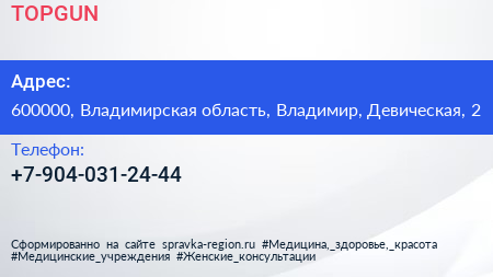 TOPGUN по адресу 600000, Владимирская область, Владимир, Девическая, 2 в дальнейшем Организация, размещена в следующих категориях:
