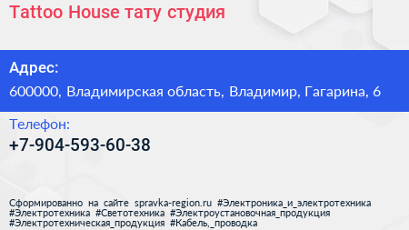 Tattoo House, тату-студия по адресу 600000, Владимирская область, Владимир, Гагарина, 6 в дальнейшем Организация, размещена в следующих категориях: