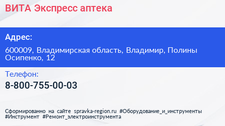 ВИТА Экспресс, аптека по адресу 600009, Владимирская область, Владимир, Полины Осипенко, 12 в дальнейшем Организация, размещена в следующих категориях: