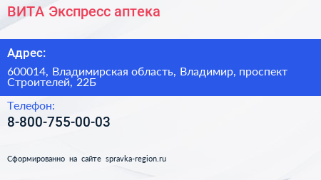 ВИТА Экспресс, аптека по адресу 600014, Владимирская область, Владимир, проспект Строителей, 22Б в дальнейшем Организация, размещена в следующих категориях: