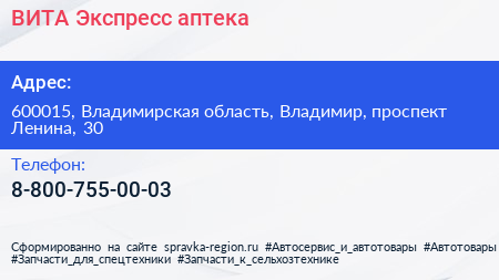 ВИТА Экспресс, аптека по адресу 600015, Владимирская область, Владимир, проспект Ленина, 30 в дальнейшем Организация, размещена в следующих категориях: