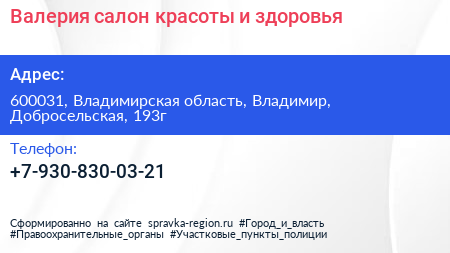 Валерия, салон красоты и здоровья по адресу 600031, Владимирская область, Владимир, Добросельская, 193г в дальнейшем Организация, размещена в следующих категориях: