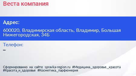 Веста, компания по адресу 600020, Владимирская область, Владимир, Большая Нижегородская, 34Б в дальнейшем Организация, размещена в следующих категориях: