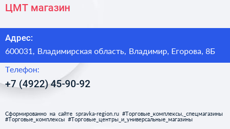 ЦМТ, магазин по адресу 600031, Владимирская область, Владимир, Егорова, 8Б в дальнейшем Организация, размещена в следующих категориях: