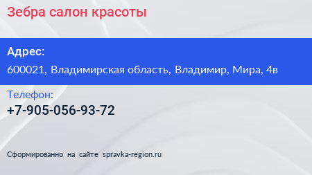 Зебра, салон красоты по адресу 600021, Владимирская область, Владимир, Мира, 4в в дальнейшем Организация, размещена в следующих категориях: