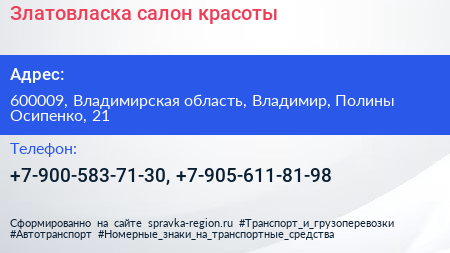 Златовласка, салон красоты по адресу 600009, Владимирская область, Владимир, Полины Осипенко, 21 в дальнейшем Организация, размещена в следующих категориях: