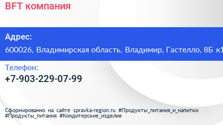 BFT, компания по адресу 600026, Владимирская область, Владимир, Гастелло, 8Б к1 в дальнейшем Организация, размещена в следующих категориях:
