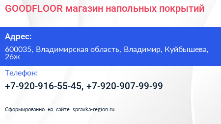 GOODFLOOR, магазин напольных покрытий по адресу 600035, Владимирская область, Владимир, Куйбышева, 26ж в дальнейшем Организация, размещена в следующих категориях: