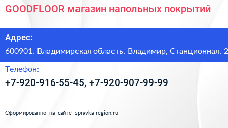 GOODFLOOR, магазин напольных покрытий по адресу 600901, Владимирская область, Владимир, Станционная, 2 в дальнейшем Организация, размещена в следующих категориях: