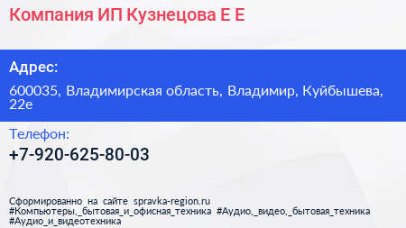 Компания, ИП Кузнецова Е.Е. по адресу 600035, Владимирская область, Владимир, Куйбышева, 22е в дальнейшем Организация, размещена в следующих категориях: