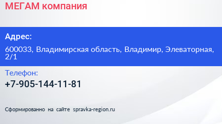 МЕГАМ, компания по адресу 600033, Владимирская область, Владимир, Элеваторная, 2/1 в дальнейшем Организация, размещена в следующих категориях: