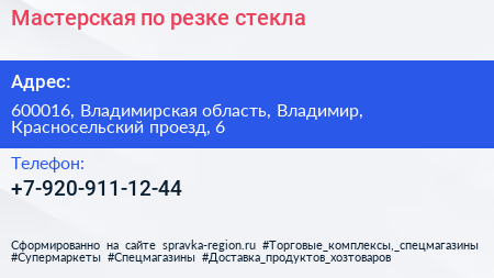 Мастерская по резке стекла по адресу 600016, Владимирская область, Владимир, Красносельский проезд, 6 в дальнейшем Организация, размещена в следующих категориях: