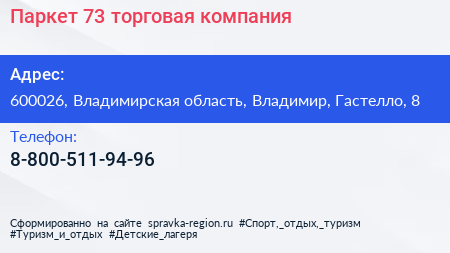 Паркет 73, торговая компания по адресу 600026, Владимирская область, Владимир, Гастелло, 8 в дальнейшем Организация, размещена в следующих категориях: