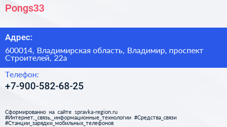 Pongs33 по адресу 600014, Владимирская область, Владимир, проспект Строителей, 22а в дальнейшем Организация, размещена в следующих категориях: