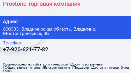 Prostone, торговая компания по адресу 600033, Владимирская область, Владимир, Мостостроевская, 3Б в дальнейшем Организация, размещена в следующих категориях: