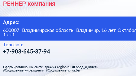 РЕННЕР, компания по адресу 600007, Владимирская область, Владимир, 16 лет Октября, 1 ст1 в дальнейшем Организация, размещена в следующих категориях: