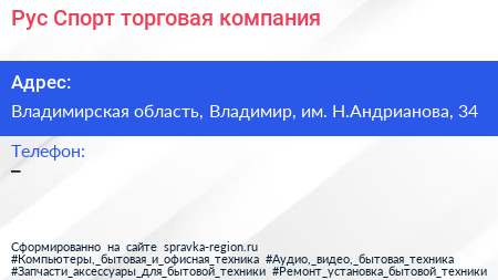 Рус-Спорт, торговая компания по адресу Владимирская область, Владимир, им. Н.Андрианова, 34 в дальнейшем Организация, размещена в следующих категориях: