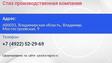 Стиз, производственная компания по адресу 600033, Владимирская область, Владимир, Мостостроевская, 9 в дальнейшем Организация, размещена в следующих категориях: