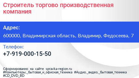 Строитель, торгово-производственная компания по адресу 600000, Владимирская область, Владимир, Федосеева, 7 в дальнейшем Организация, размещена в следующих категориях: