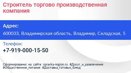 Строитель, торгово-производственная компания по адресу 600033, Владимирская область, Владимир, Складская, 5 в дальнейшем Организация, размещена в следующих категориях: