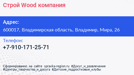 Строй Wood, компания по адресу 600017, Владимирская область, Владимир, Мира, 26 в дальнейшем Организация, размещена в следующих категориях: