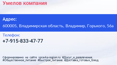Умелов, компания по адресу 600005, Владимирская область, Владимир, Горького, 56а в дальнейшем Организация, размещена в следующих категориях: