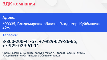 ВДК, компания по адресу 600035, Владимирская область, Владимир, Куйбышева, 26ж в дальнейшем Организация, размещена в следующих категориях: