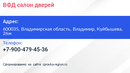 ВФД, салон дверей по адресу 600035, Владимирская область, Владимир, Куйбышева, 26ж в дальнейшем Организация, размещена в следующих категориях:
