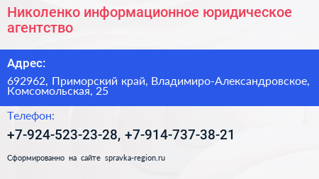 Николенко, информационное юридическое агентство по адресу 692962, Приморский край, Владимиро-Александровское, Комсомольская, 25 в дальнейшем Организация, размещена в следующих категориях: