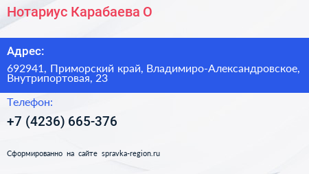 Нотариус Карабаева О. по адресу 692941, Приморский край, Владимиро-Александровское, Внутрипортовая, 23 в дальнейшем Организация, размещена в следующих категориях: