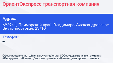 ОриентЭкспресс, транспортная компания по адресу 692941, Приморский край, Владимиро-Александровское, Внутрипортовая, 23/10 в дальнейшем Организация, размещена в следующих категориях: