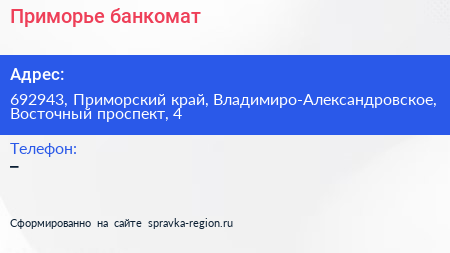 Приморье, банкомат по адресу 692943, Приморский край, Владимиро-Александровское, Восточный проспект, 4 в дальнейшем Организация, размещена в следующих категориях: