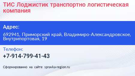 ТИС-Лоджистик, транспортно-логистическая компания по адресу 692941, Приморский край, Владимиро-Александровское, Внутрипортовая, 19 в дальнейшем Организация, размещена в следующих категориях: