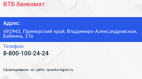 ВТБ, банкомат по адресу 692943, Приморский край, Владимиро-Александровское, Бабкина, 17а в дальнейшем Организация, размещена в следующих категориях: